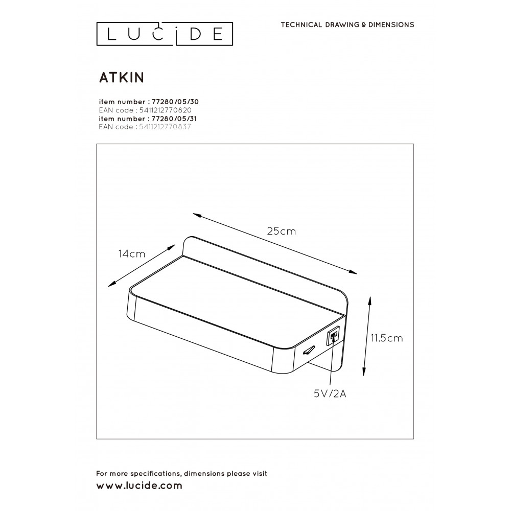 ATKIN - Nástenné svietidlo - LED 5W+USB port 25/14/11cm - čierna